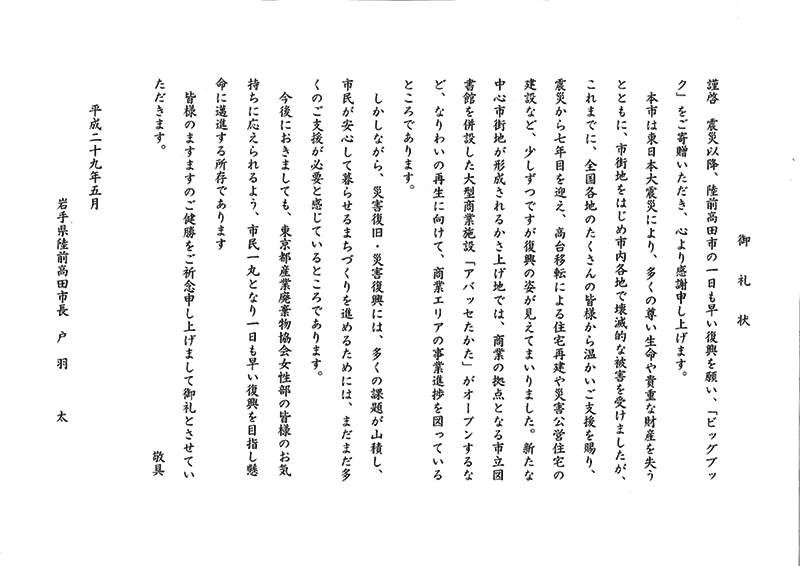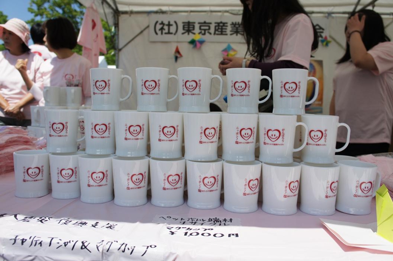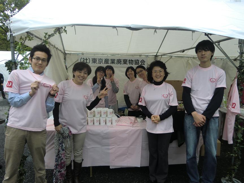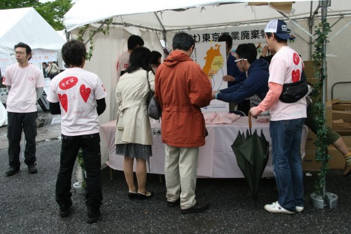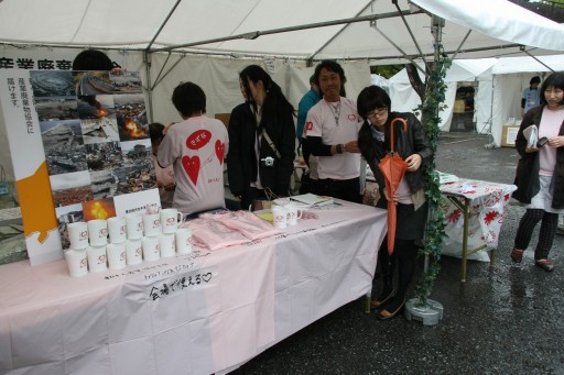 冷たい雨にも負けず!初のコラボ企画冷たい雨にも負けず!初のコラボ企画 あいにくの季節外れの冷たい雨と風の中、4月23日(土)、女性部として初めて「アースデイ東京」に参加しました。今回はもう一つ初の試みとして、青年部とのコラボレーションでの出展となりました。 そんな初めての出展内容の検討を進める中、3月11日に東日本大震災が発生し、その影響により出展内容を大幅に変更することになりました。そして出展内容は「チャリティーマグカップ」と「チャリティーTシャツ」の販売を通して得られた金額のうち原価を除いた利益を、震災により大きな被害を受けた地域の産業廃棄物 協会に役立てて頂くということになりました。