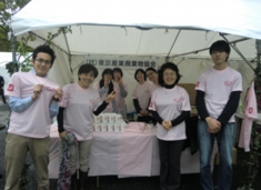 来場者に趣旨説明来場者に趣旨説明 Tシャツは青年部からの提案で「ピンク」色。この桜色のTシャツを着た青年部と女性部の参加者でブースの周りは雨の中でも華やいでいました。Tシャツの表と、マグカップにはハートのロゴと「がんばろうニッポン!」の文字、Tシャツの後ろには手と手をつないだハートマークと「きずな」の文字。そんなTシャツを着た私たち女性部と青年部の参加者からも「きずな」が生まれ、Tシャツを買って頂いた方々、そして、その方々の義援金が渡るであろう先にも「きずな」が広まっていくような願いが感じられる一方で、実際に多くの青年部・女性部の参加者もTシャツやマグカップを買われていたことからも「きずな」を実感しました。