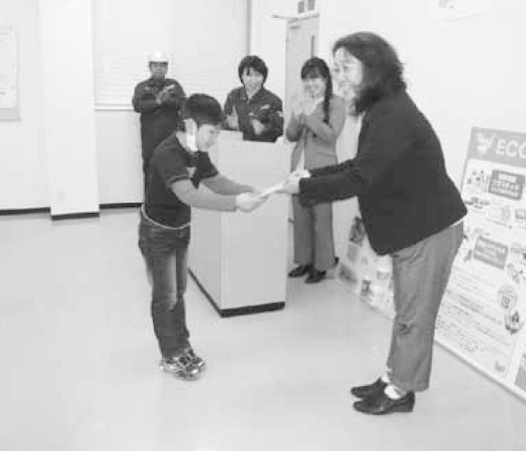 グループに分けたディスカッショングループに分けたディスカッション その後、グループに分かれ、別室にて『廃棄物業界に対するイメージ』『将来の廃棄物処理業界のあり方』というテーマでグループディスカッションに入り、各グループの代表者がその結果について発表を行いました。業界というより、廃棄物のイメージは、やはり暗い、汚い、臭いというマイナスイメージを持っている学生さんがほとんどでしたが、「女性部の皆さんのお話を伺い、ゴミをゴミと思わず商品と思っていかないと明るい地球はない…。」などの意見も多数上がりました。