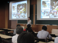 学生さんの活動状況発表風景学生さんの活動状況発表風景 4つめは『ウミガメとの出会い』という内容で、実際に屋久島にウミガメの産卵を見に行ったグループからの報告でした。屋久島では絶滅危惧種のウミガメの産卵が行われているのですが、人が捨てたごみや釣り針などが砂浜に上がり、産卵に来る亀の数が減ってきているそうです。最後のグループの報告は、同じ屋久島の廃棄物の現状についてでした。屋久島には現在も廃プラスチック類の廃棄物が野積されているそうです。廃棄物は宮崎県に運び処理をしたそうですが、3万円/tの運搬費がかかり7,000tは処理されましたが、あまりに高額な為、経済上中止されたそうです。