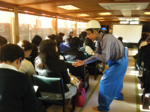 ずらっと並んだ復興支援エコマグカップ荒天の土曜日 二木女性部部長とみんな笑顔で